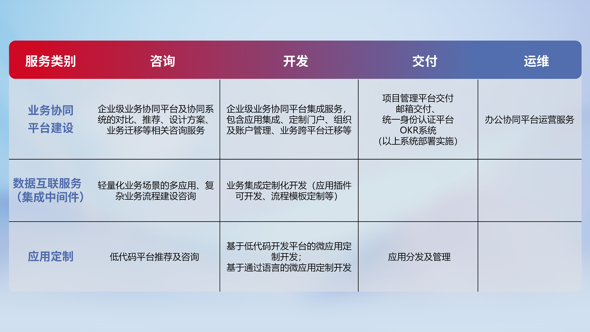 针对钉钉、、、、企微、、、、IDaas等平台级产品提供产品的规划、、、、方案、、、、交付、、、、定制化开发等服务,,实现如统一协同办公、、智能客户服务、、混合会议管理、、智能数据查询、、、等业务场景,,实现数字化转型。。。。